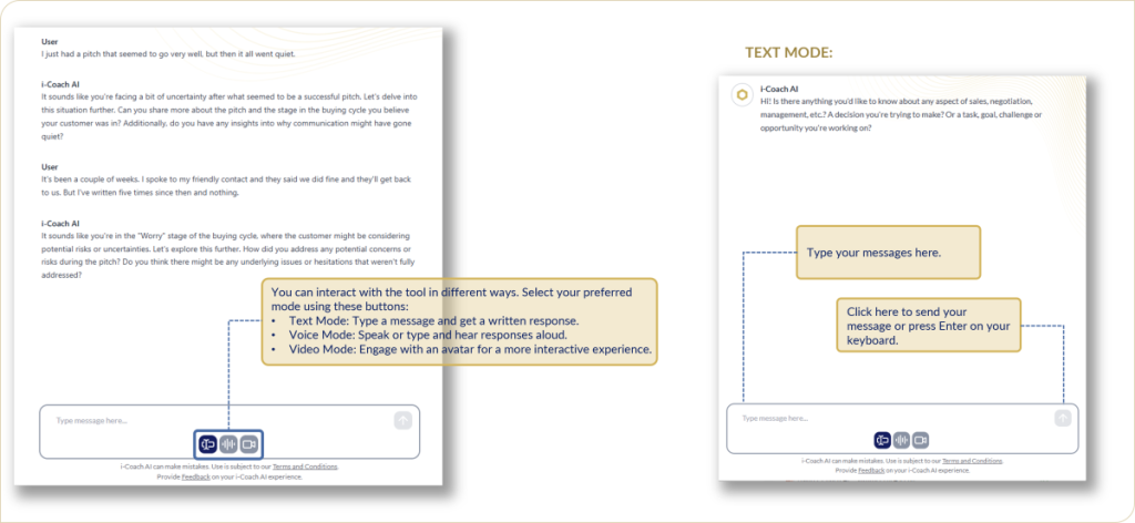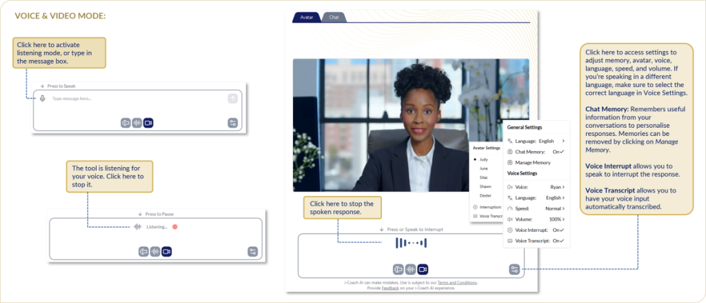 Thank you for accessing the demonstration of i-Coach AI. I-Coach AI is being provided to you for this purpose on an ‘as is’ basis and without any warranties of any kind. You should read the Terms and Conditions and Privacy Notice on i-Coach before starting your pilot.